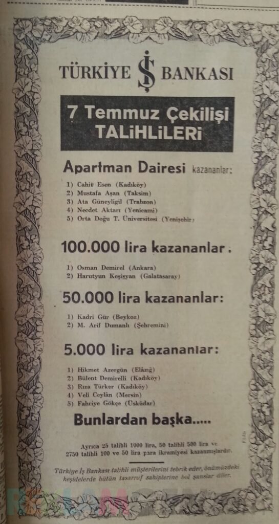 Türkiye’de 60’ların başında banka reklamları popülerleşmeye başlamıştı. Eskiden gazetelerde okurlar hep bu tip ilanlar görürlerdi ama 60’lı yılların ilk birkaç yılı, para, araba, ev gibi para veren banka piyangolarının doruk noktasıydı.